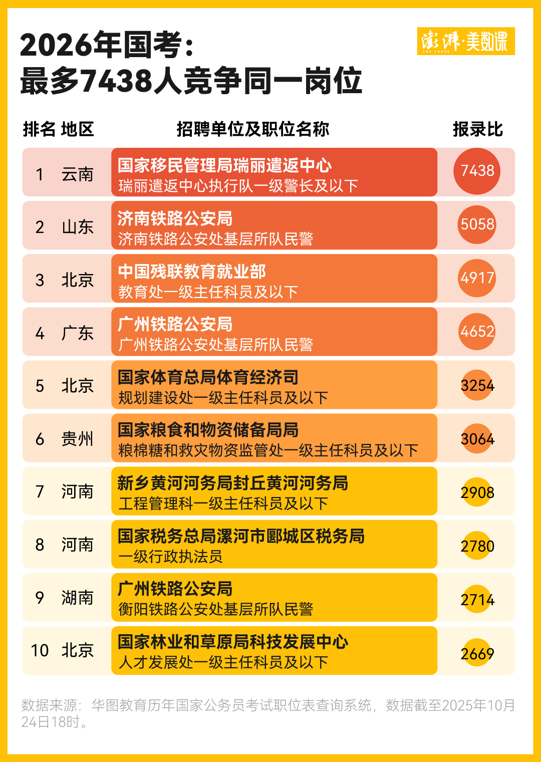 报录比最高、竞争最激烈的岗位是历年国考报名的关注焦点。华图教育数据显示,2026年国考竞争最激烈岗位是“瑞丽遣返中心执行队一级警长及以下”,报录比为7438:1。其他上榜今年十大热门岗位的还有来自公安局、残联、体育局、税务局等部门的岗位。